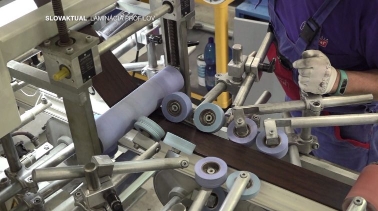 Jedným z počiatočných výrobných procesov pri výrobe okien a dverí je laminácia 6 metrov dlhých plastových a hliníkových profilov.