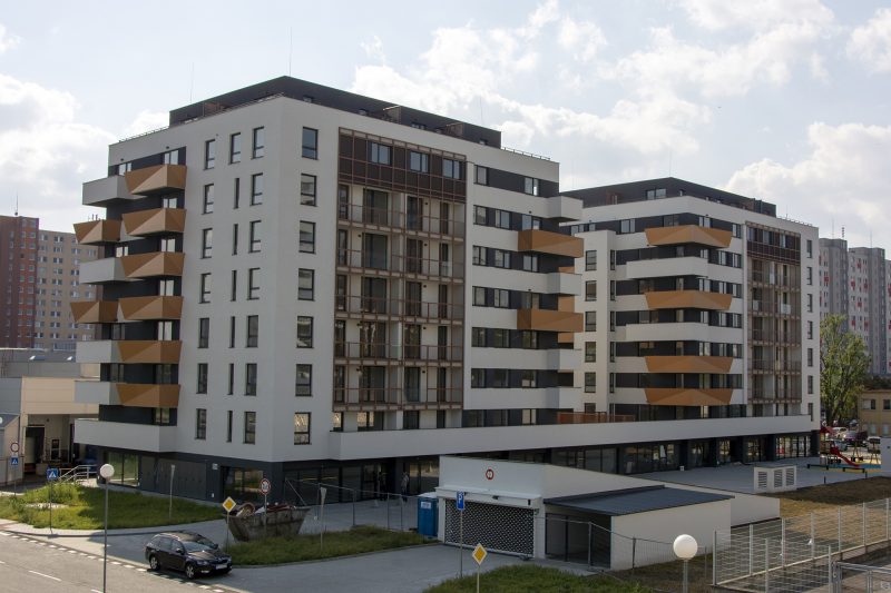 Dva spojené deväť-podlažné objekty vytvorili priestor pre 112 bytov a 13 apartmánov.