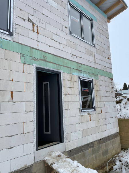 Použitý profil Pasiv HL vo farbe bridlicová sivá, HST portál Premidoor 88 s bezpečnostnými kalenými ESG sklami.